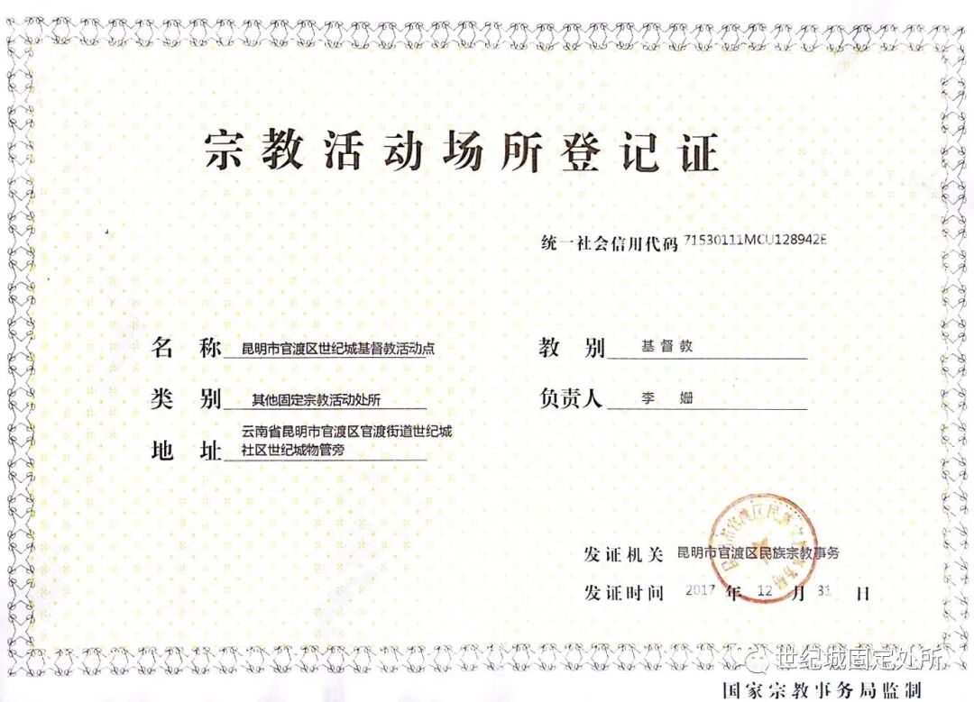 2017年12月31日,昆明市官渡区民族宗教事务局正式给昆明市官渡区世纪城基督教活动点颁发“宗教活动场所登记证”。负责人:李姗(普云善)牧师。